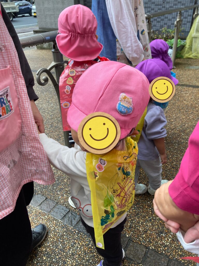 10月の末のある日のおさんぽで、シール貼りやお絵描きしたカラフルなマントをつけてお出かけしました。