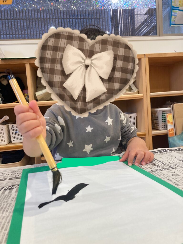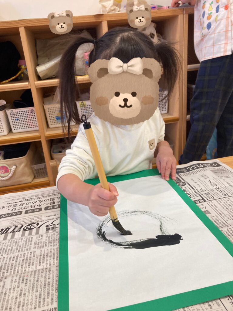 本物の半紙と墨汁を使って書初めや凧揚げも楽しみました!