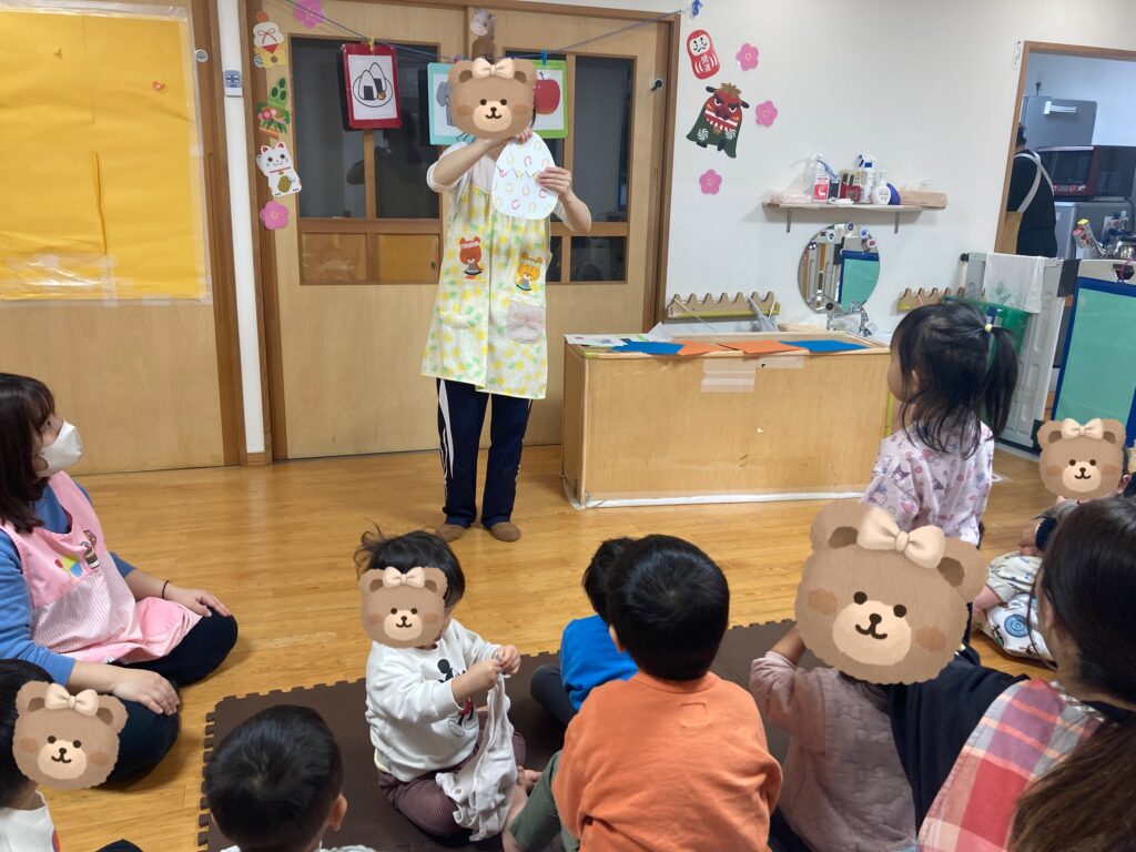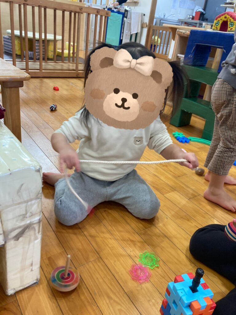 福笑いやコマ回し、カルタにお手玉など色々なお正月遊びを見せてもらい、子どもたちも挑戦しました。少し難しそうにする子もいましたが楽しく遊ぶことができました。