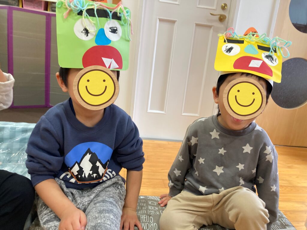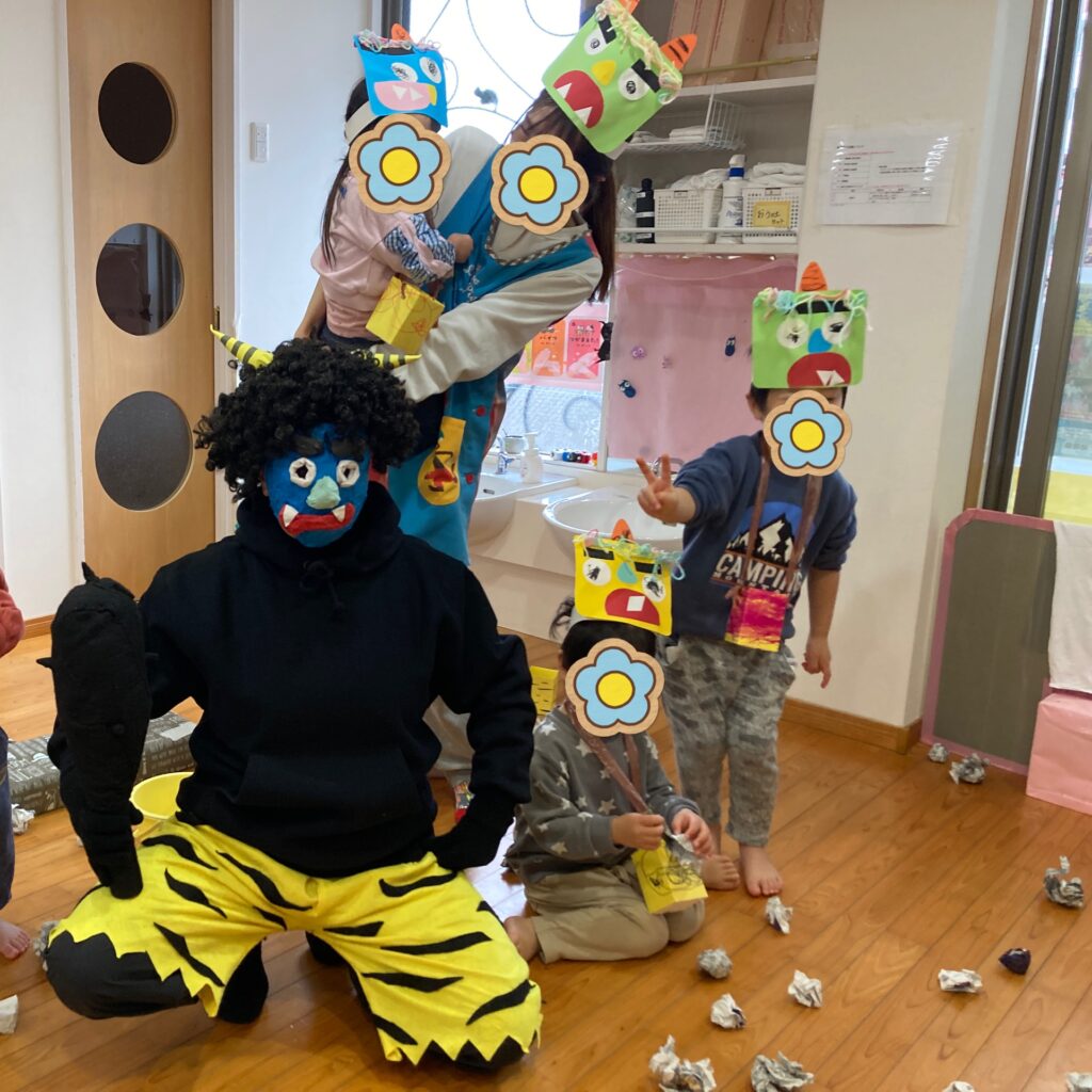 節分のつどいの日を楽しみに、数日前からオニのお面の製作をしたり、オニの登場する絵本やうたや手遊びをして楽しんでいました♪